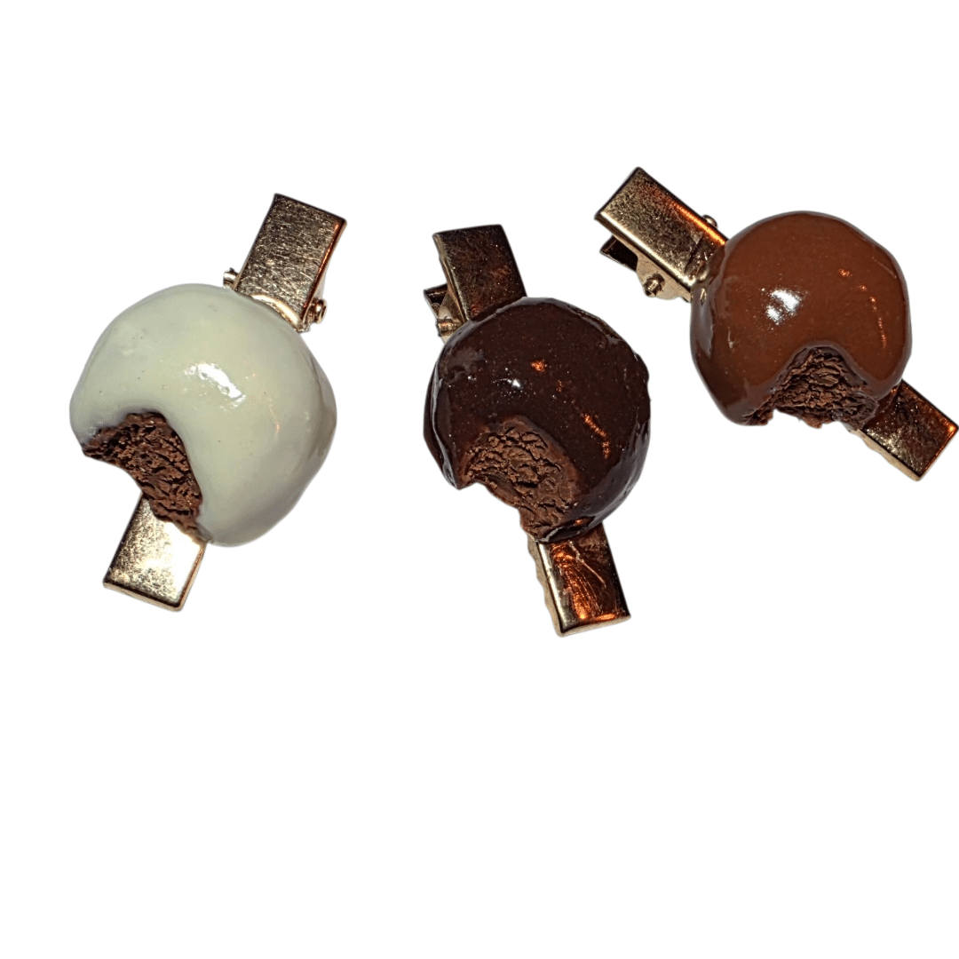 Met de hand gemaakt van polymeerklei, verkrijgbaar in melk, wit of puur, en te dragen als pinbrosje, haarknipje of haar-elastiekje. Zo kun je de magie van de Sint en zijn lekkernijen altijd bij je dragen.